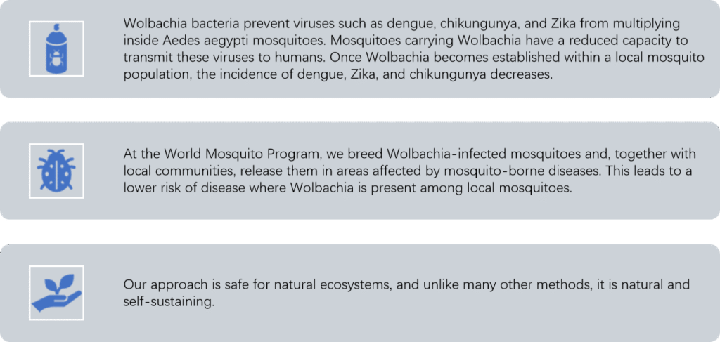 Mosquito-borne outbreaks are unpredictable, and reactive response systems are costly, slow, and often too late. The World Mosquito Program (WMP) offers a safe, scientifically proven and cost-effective alternative already successfully deployed in 15 countries worldwide.