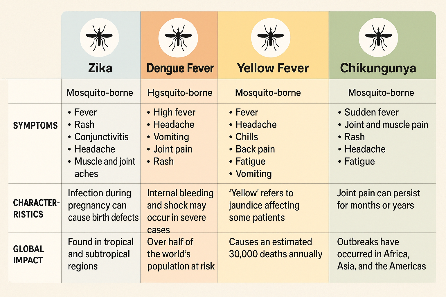 Common types of mosquito-borne diseases include malaria, dengue, West Nile virus, chikungunya, yellow fever and Zika.