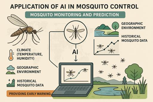 AI analyzes climate (temperature, humidity), geographic environment, and historical mosquito data to predict mosquito density and active periods in specific areas, providing early warnings.