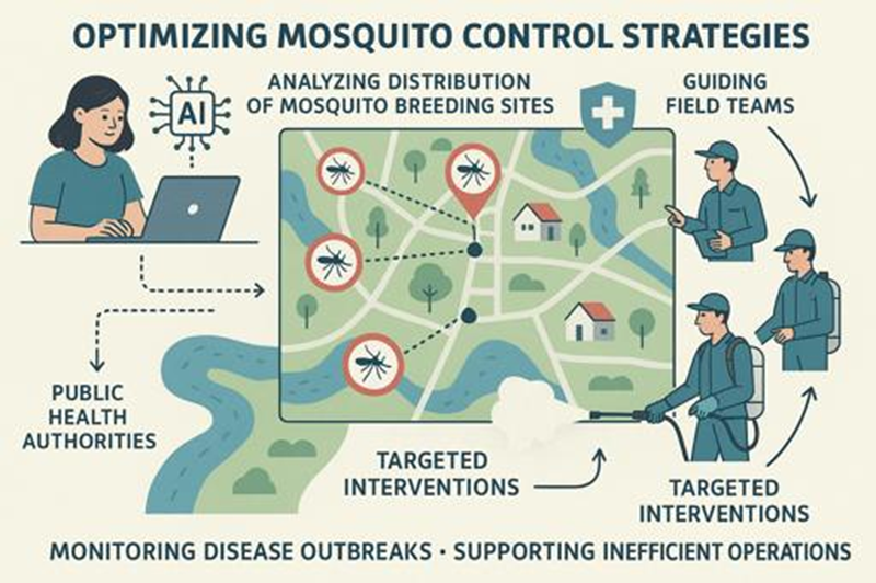 AI assists public health authorities by analyzing the distribution of mosquito breeding sites to guide field teams for disease outbreaks monitoring, and targeted interventions supporting, to reduce inefficient operations.